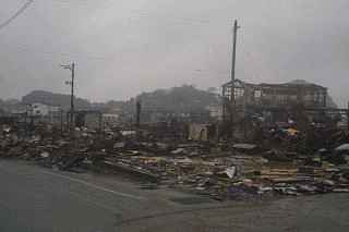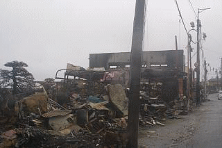 久之浜の中心部が11日震災・津波直後発生した火災は、断水、津波による破壊で消防もできず、悲惨な状態になっていました。一ヶ月近くなっていても焼けた臭いも立ち込めていました。